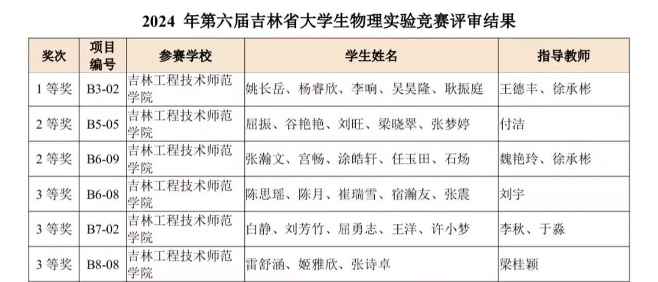 2024年8月31日-9月1日,我院物理教研室教师积极组织学生参加了由吉林省物理学会、吉林省高等教育学会、吉林省物理学类专业教学指导委员会主办,吉林师范大学物理学院承办的“2024 年第六届吉林省大学生物理实验竞赛”。共有来自全省22所高校的422名选手参加,竞赛作品分为命题类、自选类和讲课类三个类别。竞赛组织委员会根据《吉林省大学生物理实验竞赛章程》,组织评审专家对竞赛作品进行认真评阅,最终评选出一等奖26项,二等奖38项,三等奖50项。
