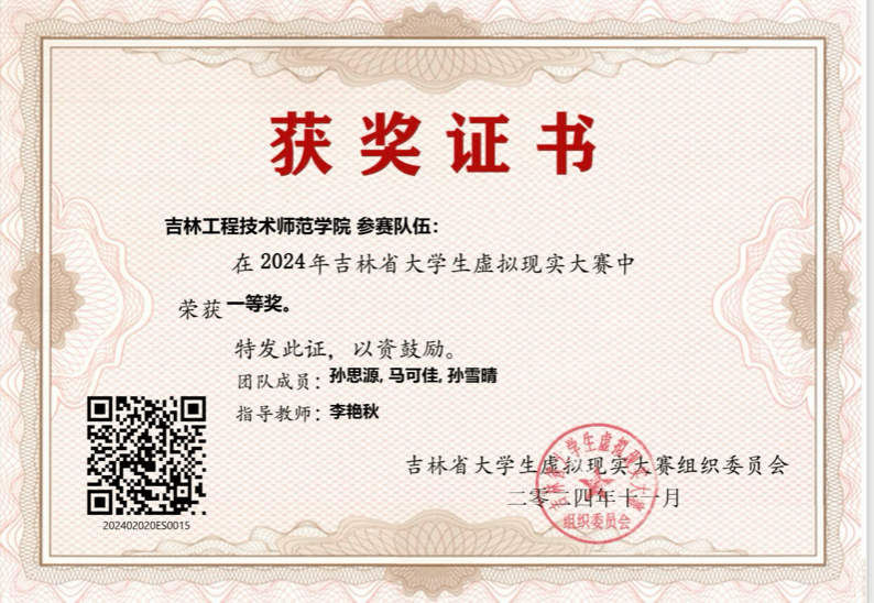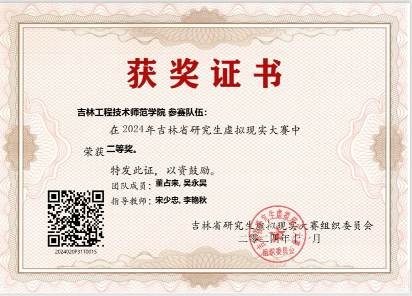 10月20日,由吉林省教育厅主办、长春大学承办的2024年吉林省“研究生、大学生”虚拟现实大赛决赛在长春大学圆满落幕。我院研究生在此次大赛中表现优异,荣获一等奖1项、二等奖1项。