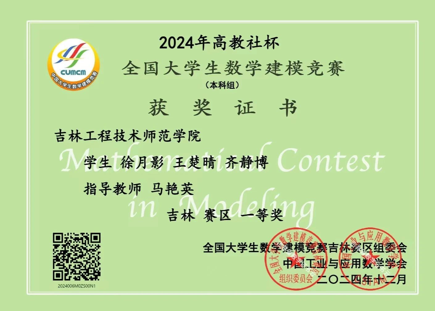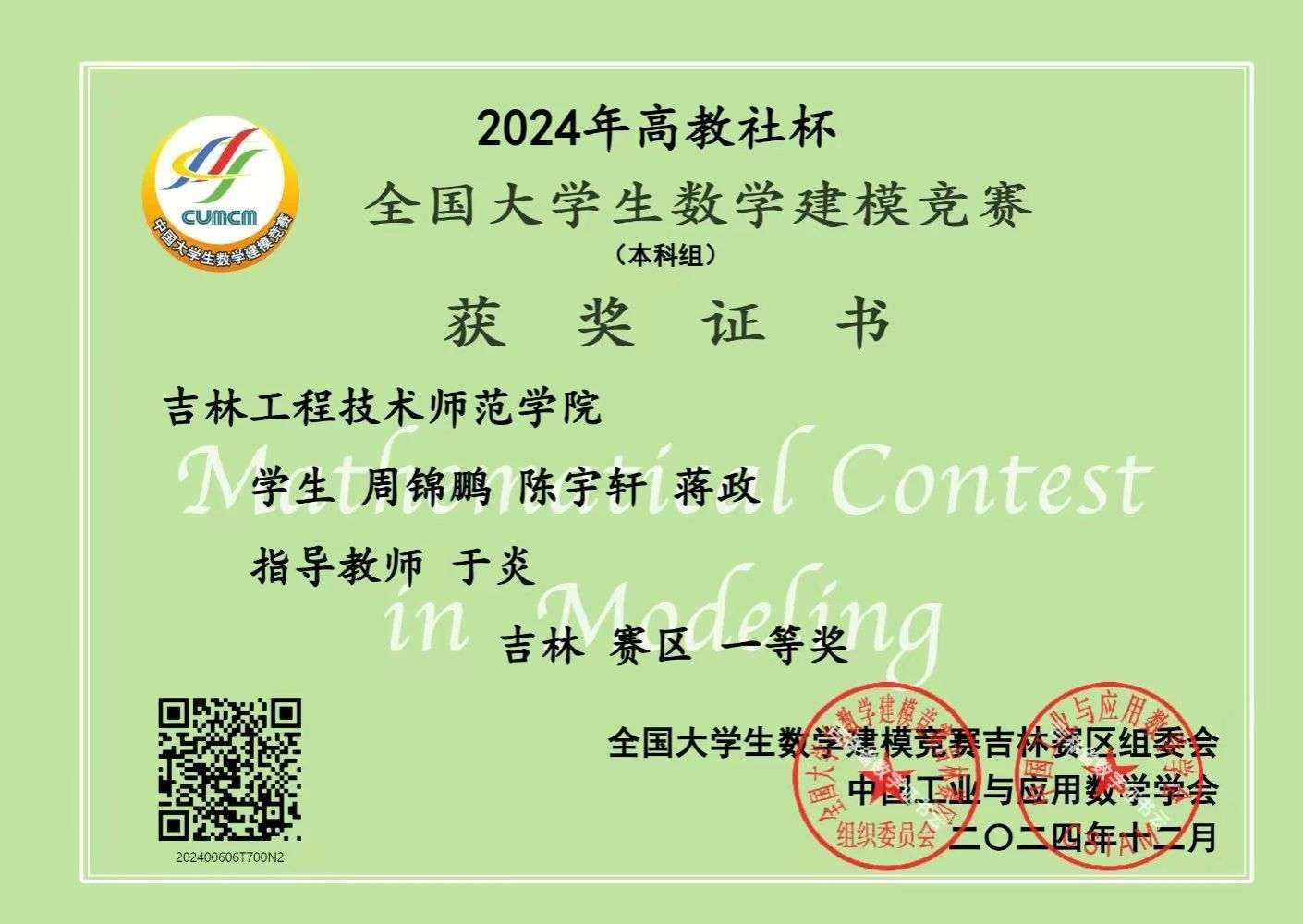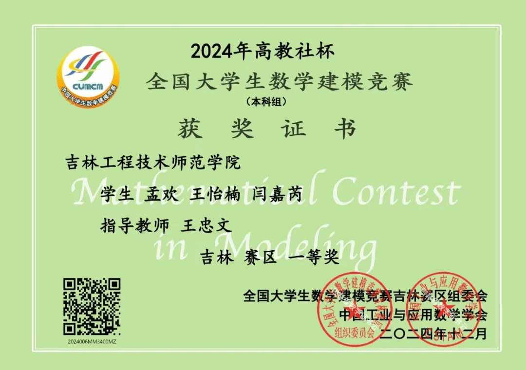 在2024年全国大学生数学建模竞赛中,学院同学凭借卓越的智慧、顽强的毅力和出色的团队协作精神,再创佳绩,斩获一等奖4项,二等奖14项,三等奖8项,为学校争得了荣誉!