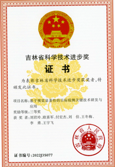 我院教师刘君玲在2022年度荣获吉林省科学技术进步奖三等级 来源:学术成果 2023/04/13 近日,公布了2022年度吉林省科学技术进步奖获奖名单,我院教师刘君玲教授主持的项目《基于视觉显著性的目标检测关键技术研发与应用》成功获得吉林省科学技术进步奖三等奖。