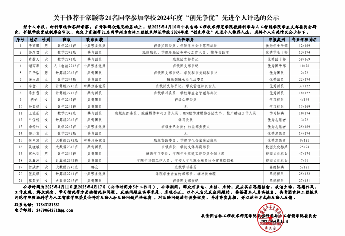 关于推荐于家灏等21名同学参加学校2024年度“创先争优”先进个人评选的公示