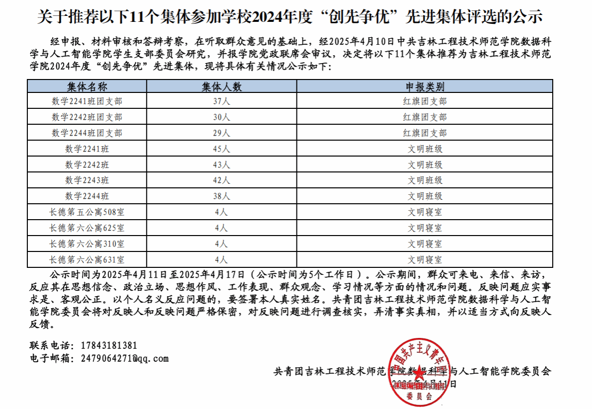 关于推荐以下11个集体参加学校2024年度“创先争优”先进集体评选的公示